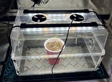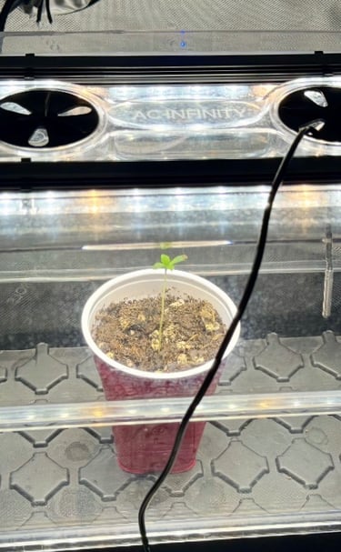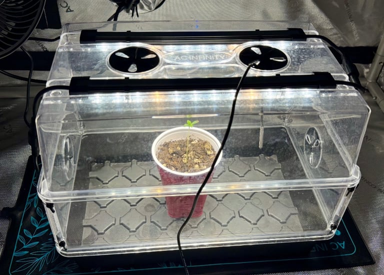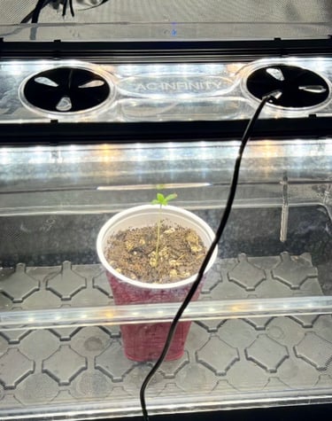 The seedling stage generally lasts for two or three weeks post-germination. Once the germinated cannabis seed develops a taproot and goes into the soil, the first sprout will start to emerge and the first cotyledons (circular leaves) develop.